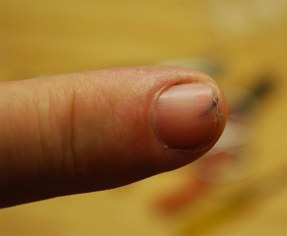 In the morning the finger end was red, warm, swollen and exquisitely painful. Rubor, calor, tumor, dolor. As soon as I could see, I took a pair of scissors and poked around a bit under the nail. Hell’s teeth, it hurt. There was something dark. Clotted blood or wicked wood? Whatever, it was I dug it out.