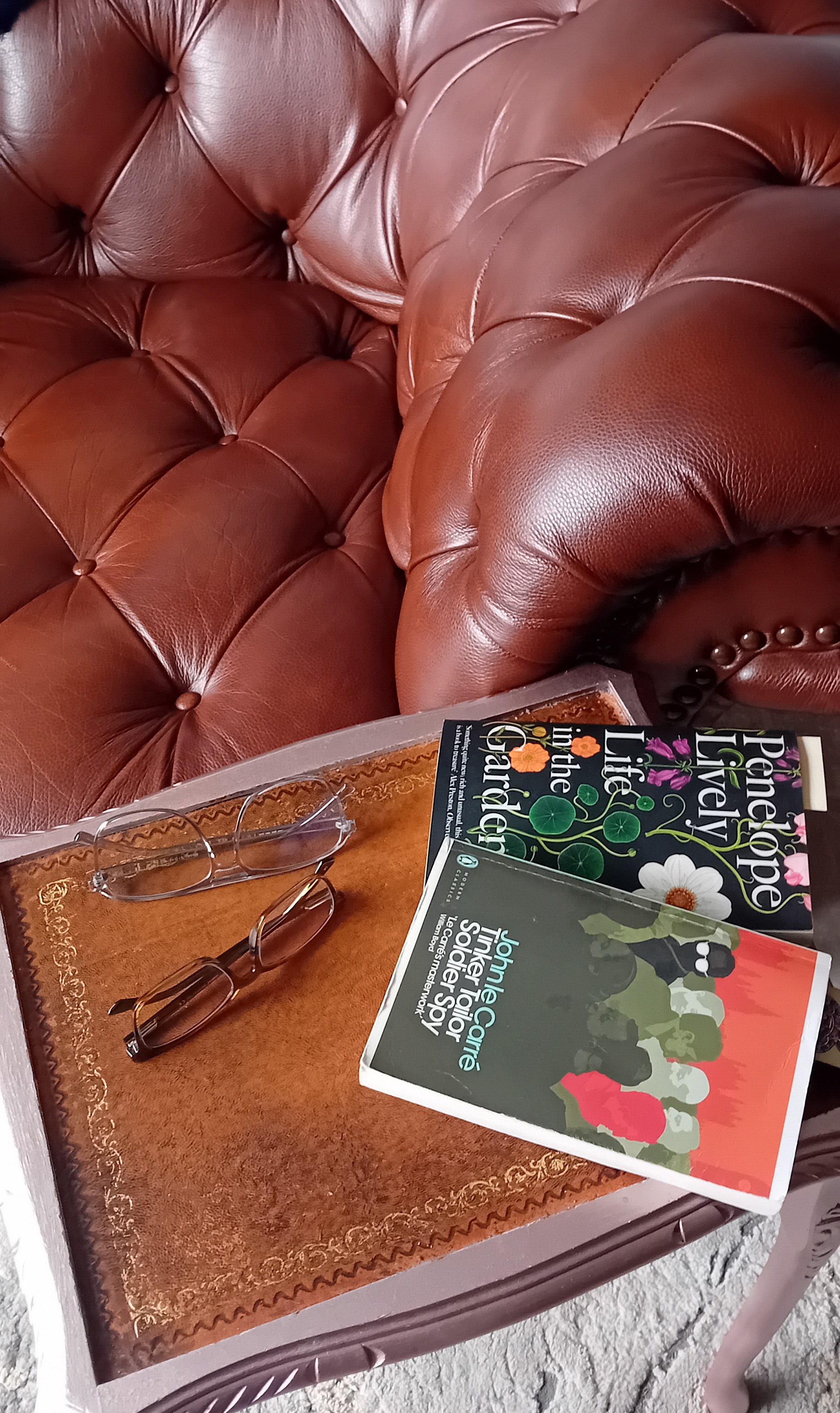 To my right is a sleepy dog, somewhat perturbed at being woken, but I’d warrant glad for a quick sniff in the garden; no foxes. To my left are two books. I’d thought about picking up the one I am currently reading, but remembered it was in the car. I closed the living room door, turned on the lamp and squinted at the bookcase. I was looking for a certain book on emotional intelligence. Why? Because of aforementioned nonsense in work. Bored of the idea as soon as I picked it up, my hands soon settled on Penelope Lively’s ‘Life in the Garden’. This gem is then placed on the table by the couch. Remembering that my glasses are in the car with the current novel, I crept up the hall and memory tentatively extended my hand in the dark to retrieve a pair of spectacles from the desk in the ‘office’ (a.k.a box room. Notions!). Success. Now, having settled into the corner of couch, I commence the serious act of reading. No sooner have I started to read, than I realise these glasses have some treatment on them to reduce glare and other such vagaries of modernity. Nuts to this, I’m off to the car. Hence the garden sniffs for her ladyship.